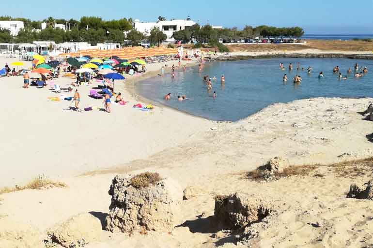 Pláž Faraglioni Torre Guaceto leží kousek od přírodní rezervace Torre Guaceto, autem od apartmánu asi 15 minut. Parkovat se dá buď podél silnice jako místní, nebo na placeném parkovišti (4 €) a dojít pěšky k pobřeží. Cesta k pláži vede po tmavých písčitých útesech s množstvím malých zátok a plážiček, takže si každý může najít své místo. Voda je velmi čistá a vstup do moře je pozvolný, vhodný i pro malé děti. Lidé, co rádi šnorchlují nebo sbírají mušle, si to tu pravděpodobně užijí nejvíc.